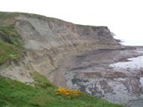 David was hoping for tea in Hawsker, but there was none to be had, so we carried on down to a fixed caravan park just above the coast's tall cliffs. This time we were lucky and we were able to stop and get some tea and sandwiches from the site shop / café. We sat around for twenty minutes then decided that it was time for the final stage, the four miles along the cliff tops south to the walk's end.